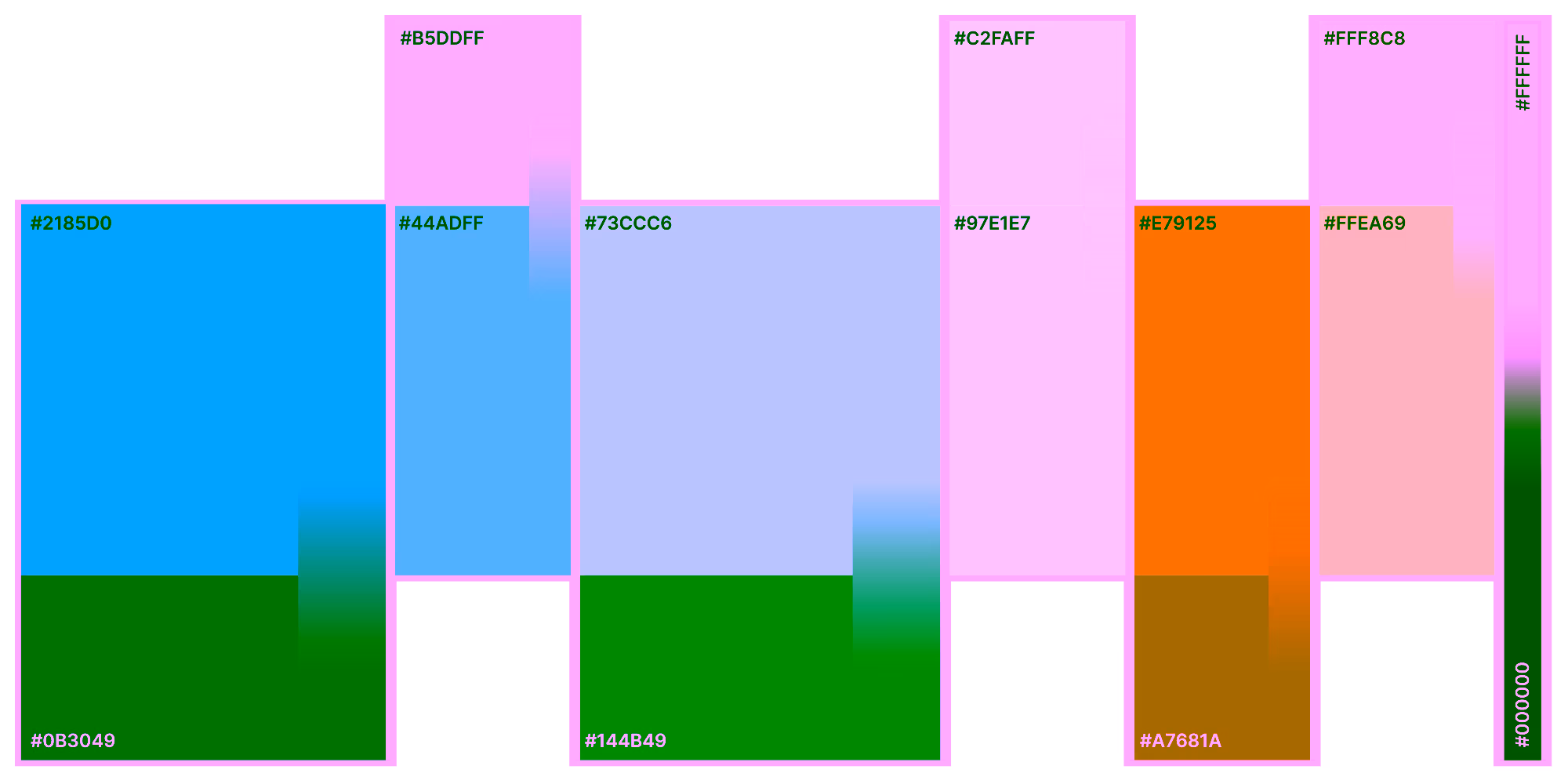 Codeberg colors cover an overall bright, varied, slightly less saturated palette. Each of the three main colors has a darker version, but also gets paired with lighter and more saturated alternatives. Plain black and white are included to indicate use of colors isn't mandatory.
