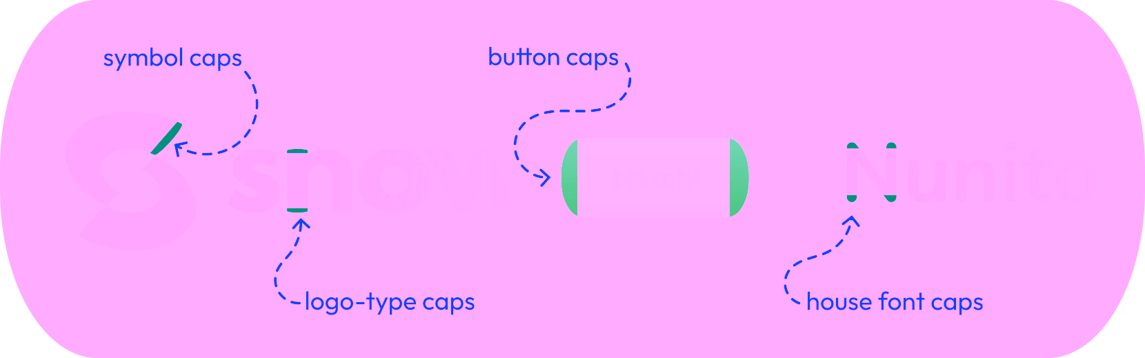 Another recurring element throughout the brand is a softened cap, which can be found in the logo symbol, the logo type, buttons and even is part of every letter in the house font.