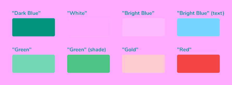 The palette follows the theme and leans on White and shades of Blue, adding green as the underlying positive impulse. Gold and Red remain accent colors reserved for most critical interactions: